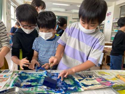 インクをつけて刷ってを繰り返して、周りの様子も描きました。
