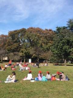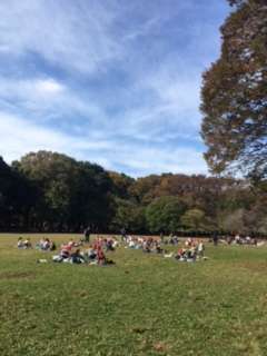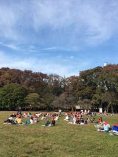 広い砧公園。お弁当の時間になりました。三密を避けて少し離れて食べています。とても美味しそう。楽しそうです。