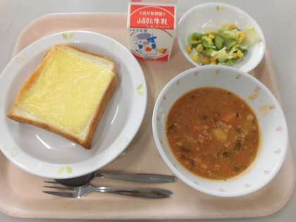 チーズトースト、ハンガリアンシチュー、白菜とコーンのサラダ