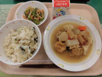 菜めし、おでん、野菜のごまあえ、牛乳