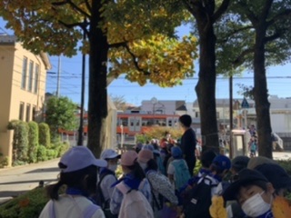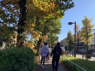今日の遠足は、秋探しの活動もします。緑道を上手に歩きながらも、色づいた木々の美しさに声をあげていました。