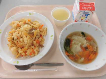 キムチチャーハン、ワンタンスープ、リンゴゼリー、牛乳