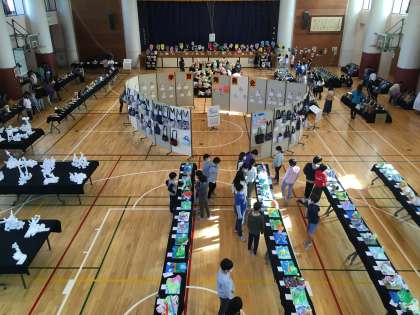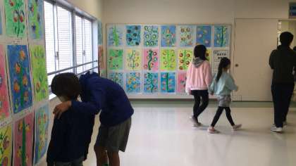 体育館と西校舎に並んだ作品を児童が鑑賞しました。