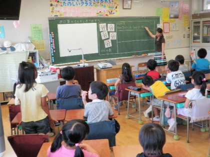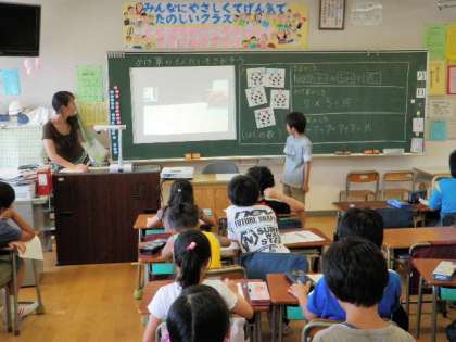 今日は、ななほしてんとう虫(星の数が七つ)を使って、「言葉の式」「かけ算の式」「たし算の式」と考えていきました。授業のまとめでは、自分で作った問題を実物投影機に映しながら、友達に発表し合いました。