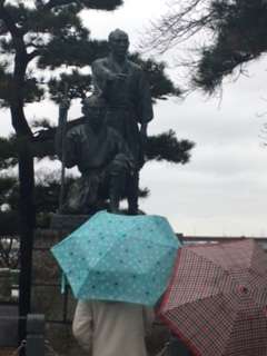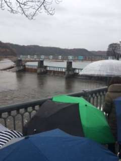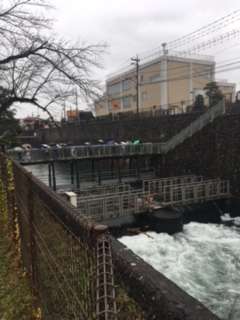 羽村取水堰に到着しました。中央高速道路で事故渋滞があったため、石川パーキングエリアでトイレ休憩をとり予定よりも約1時間遅れの到着です。残念ながら雨模様ですが、しっかり見学をしています。