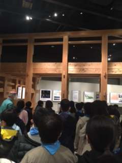 羽村市郷土博物館で見学しています。玉川上水がどのように作られたについて解説者から説明を聞いています。