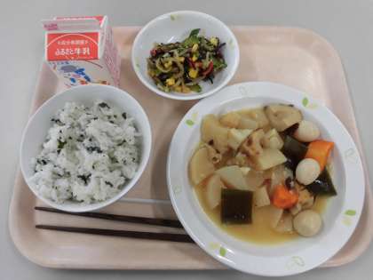 わかめごはん、おでん、大根とひじきのサラダ、牛乳
