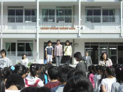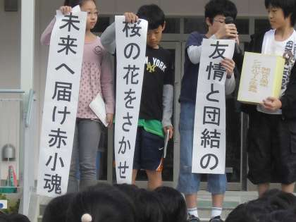 その後、代表委員会の代表の子どもたちが、60周年のテーマとして「友情と団結の桜の花をさかせよう 未来へ届け 赤小魂」に決まったことを発表しました。さらに、今週のあいさつキャンペーンについて、たてわり班の12班の代表の子どもたちが発表しました。