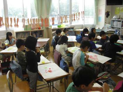 本年度も特別支援教育の副籍交流を進めています。2年生の都立大塚ろう学校永福分教室の児童が、2年2組の児童と直接に交流をしました。4校時に図工の学習と給食を食べることを一緒に行いました。昨年度は、間接の交流でしたので、学ぶことの多い一時となりました。
