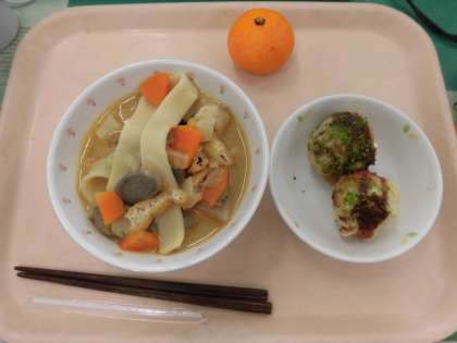 ほうとう、たこあげ、みかん、牛乳