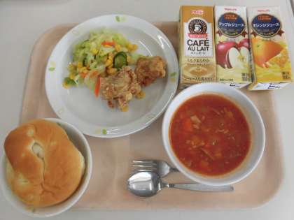 普段より大きなチキン、ミネストローネにABCマカロニが入っている、自分が選んだジュースが配膳され、子どもたちも大喜びでした。