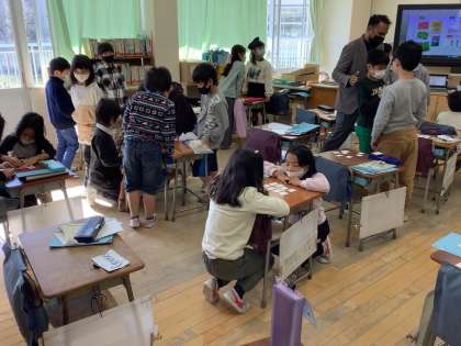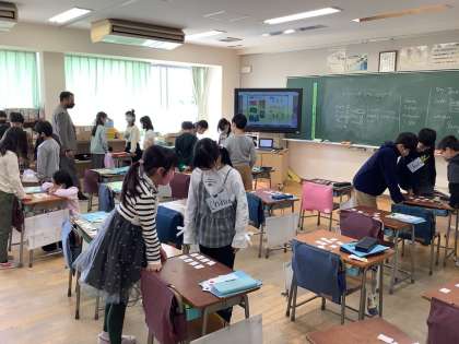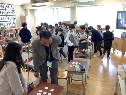 3学期最初の外国語活動では、カードに描かれた色や形を当てるシェイプクイズをしました。「What do you want」「I want 〜」を友達同士で話しながら、クイズに取り組み外国語に親しむことができました。