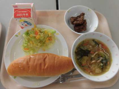 イチゴジャムサンド、鯨の竜田揚げ、コーン入りフレンチサラダ、白菜と春雨スープ