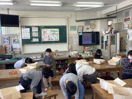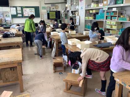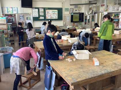 現在、3年生の図工では道具を使って作品を作る学習をしています。今回は、のこぎりを使っています。自分の想像した作品を作るため、木材に対してのこぎりを引いて、好きな形に切り出すことができました。