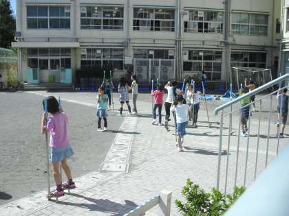 一輪車と竹馬で遊ぶことができるようになったので、校庭での遊びのバリエーションが増えました。様々な遊び方で過ごしています。校庭遊びをする児童が増えることは、望ましいことです。遊びも体力向上の一環と考えています。