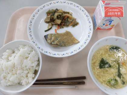 麦ごはん、魚のごまだれがけ、茎わかめのきんぴら、キノコ入りかきたま汁