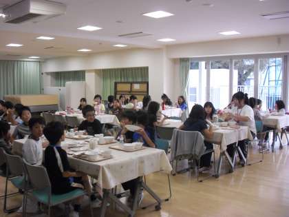 多目的室を設え、ランチルームにし、4年3組が給食を食べました。教室とは違った雰囲気の中で、友達と語らいながら、楽しいひとときとなりました。