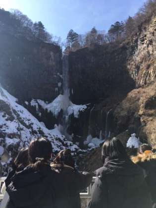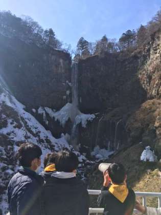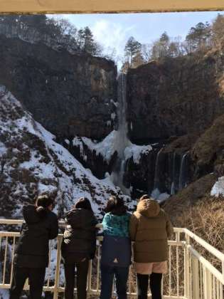 華厳の滝を見学しています。滝の中ほどは凍りついています。冬の華厳の滝も壮大。大きな滝を目の前にして子供たちも満足そうな笑顔です。