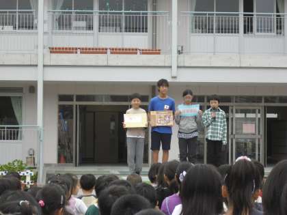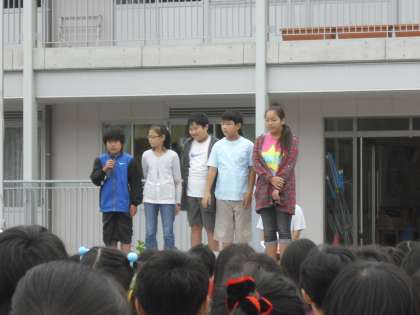 たてわり班9班の代表児童が「あいさつキャンペーン」についての話と本日より始まった読書週間に行う読み聞かせについて図書委員会の代表児童が話しました。