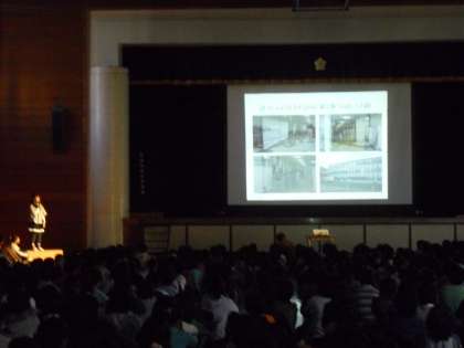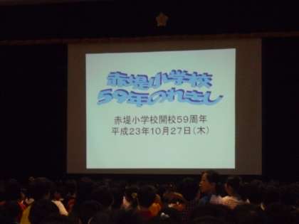 11月17日()は本校の開校記念日です。本年度は59周年です。歴史集会では、赤堤小学校ができてからの59年の歴史を振り返り、代表委員会の児童が、写真を映し出しながら、分りやすく発表しました。また、今の赤堤小学校があるのは、伝統をつくりあげてきた卒業生をはじめとして、多くの方々の支えがあるからだから感謝の気持ちをもち、伝統を引き継いでいきたいとの思いも発表しました。最後に校長が、「シンボルマークの募集締切が近づいてきたが、ぜひ多くの人が応募してほしい」ということと「来年度は、60周年を迎える年であり、きょうの発表はそのためのスタートにふさわしいものであった」と話しました。