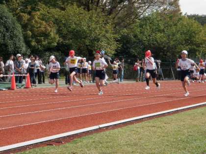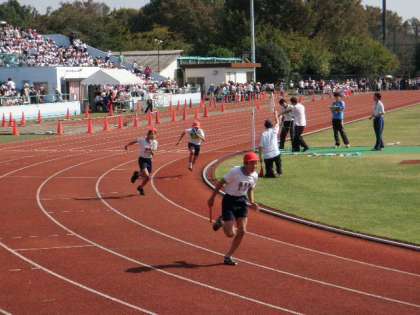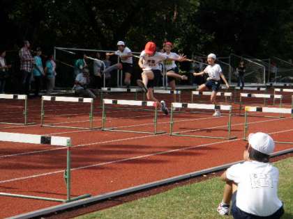 個人競技は100m走、50mハードル走、走り幅跳び、走り高跳びのうち、一人1種目に出場します。女子の個人競技が終わると、代表児童による男子400mリレー、女子400mリレーが行われました。写真は、女子100m走、女子50mハードル走、男子400mリレーの様子です。
