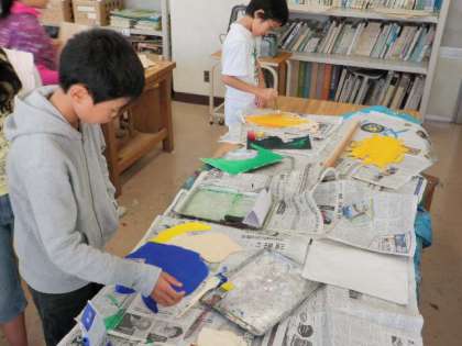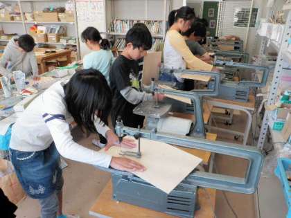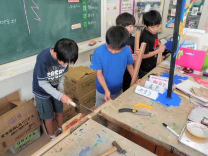 今日の授業は「糸のこドライブ・天地逆転」でした。学習発表会に向けて、みんな必死です。電動のこぎりをうまく使いこなし、曲線を上手に切っていきます。田邉先生は、いつも2時間の授業の手順を黒板に分かりやすいように表示します。子どもたちにとって、授業の見通しをつけやすいですね。