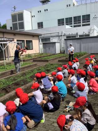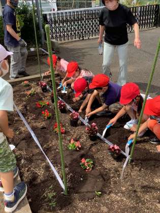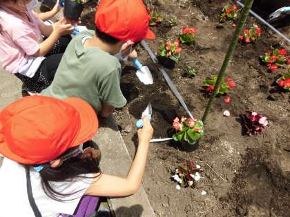 区内の農家の方に来ていただき、ベコニアの植え付け栽培方法を教えていただきました。朝顔とは違い、大きな花壇に一人一株植えていきました。手入れをすると秋まで花が楽しめるそうです。きれいな花を長く楽しめるよう、お世話をしていきます。
