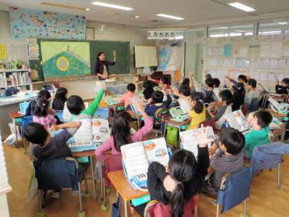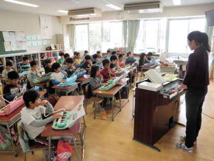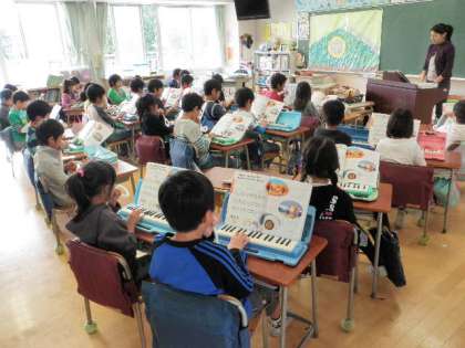 今年は、各学年で学級間交換授業を行っています。2学年は1組担任が音楽、2組担任が書写、3組担任が教科「日本語」を担当しています。今日の授業は、1組担任が2組の音楽を授業しました。「小ぎつね」の鍵盤ハーモニカの授業でしたが、みんなで指遣いを確かめてから演奏しました。列ごとに演奏させてうまく弾けていない子には、個別に指導をします。担任していない学級ですが、指示がよく通りしっかり指導ができていました。