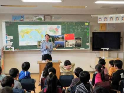 1年2組には、中国の男子学生が来てくださいました。中国語の国旗や有名な建物・動物、挨拶について、写真を用意してくださり話してくださいました。