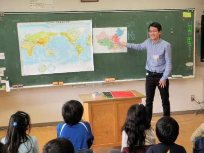 国際理解教室は、国士舘大学国際交流センターにお願いして、いろいろな国の留学生が自国の文化を紹介してくださいます。来日して間もない方もいますが、皆さん流暢な日本語でしゃべります。