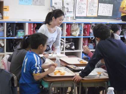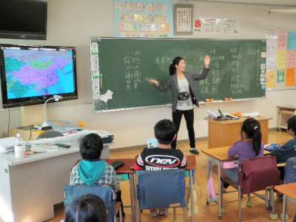 3年2組には、中国の女子学生が来てくださいました。たくさんの写真を使って、中国の有名な場所を紹介してくださいました。本物のお金も見せてくださいました。最後には、みんなで中国の歌を中国語で歌いました。