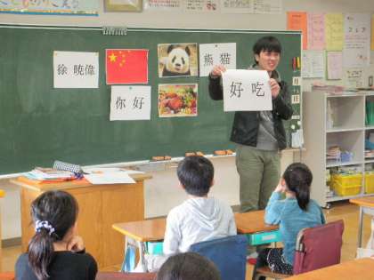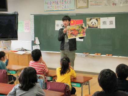 3年1組には、中国の男子学生が来てくださいました。中国の国旗や有名な建物・動物等について写真で説明してくださった後、校庭で中国のボール遊びを教えてくださいました。
