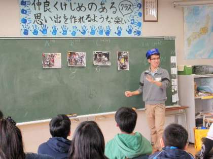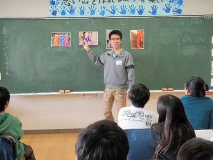 6年2組には、ベトナムの男子学生が来てくださいました。ベトナムのこと(服装、文字、タクシー)について、クイズ形式で子どもたちに話してくださいました。最後に、ベトナムの遊びも教えてくださいました