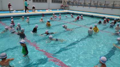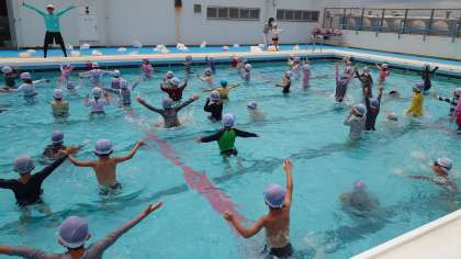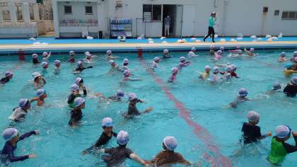 いつも通りに水着で活動した後に、長袖を着て水に入りました。いつも行っている動きをしてみると「重い」ことに気付き、びっくりしていた子どもたち。1枚の衣服でも動きにくくなることを実感しました。