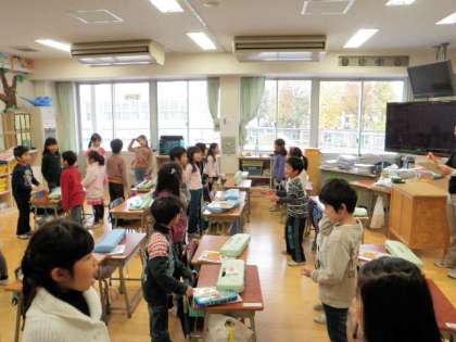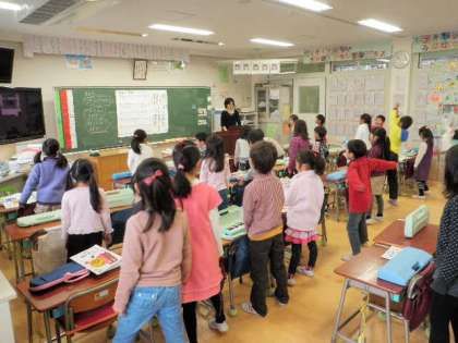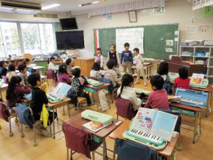 今日は、歌の授業でした。歌う前に、「足を肩幅に開く」「背筋を伸ばす」「お尻の穴をキュッと締める」の指導を受け、歌い始めました。子どもたちは、曲に合わせて体を揺らしながら楽しそうに歌います。その後、3〜4人で向かい合って、友達の顔を見ながら歌いました。口が大きく開いているかを確かめました。最後に、3〜4人が前に出て「あたらしいえがお」を歌いました。その都度、子どもたちは、互いに友達のよかったところを発表し合います。