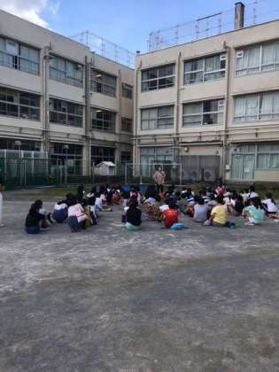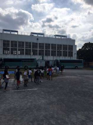 出発式をしています。子どもたちの表情から、とっても楽しみにしていることがわかります。バスが校庭に駐車できる学校は区内でもほとんどありません。赤堤小学校の施設のよさの一つです。