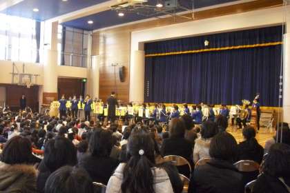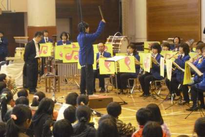 今年度最後の家庭教育学級は、世田谷区民吹奏楽団の音楽公演を行いました。土曜授業の日でしたので、2校時には、保護者の方々が、「祝典行進曲」「陽はまた昇る」「上を向いて歩こう」等6曲の演奏を聴きました。3校時は、全校児童と保護者の方々と、「トランペット吹きの休日」「勇気100%」「ディズニーセレブレーション」「ありがとう」等6曲の演奏を聴きました。楽器の紹介をしていただいたり、代表児童が指揮を教わり楽団の方々の指揮をさせていただいたり、心豊かになるひとときを過ごしました。