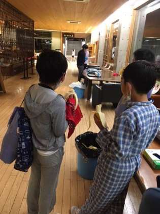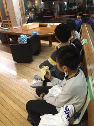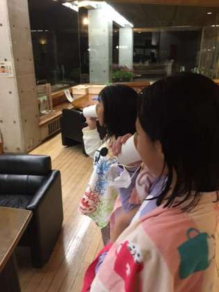 お風呂に入りました。ふじやまビレジのお風呂は温泉です。子どもたちは気持ちよかったと言って出てきました。お風呂あがりにバナナと川場のリンゴジュース。とっても美味しいそうです。