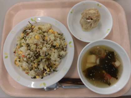 『高菜チャーハン』は、高菜の漬物を使ったチャーハンで、高菜以外にもお肉、人参やねぎなどの野菜、ちりめんじゃこ、卵と色々な具を混ぜ込んでいます。『しゅうまい』は10cm角の大きな皮を使って作りました。名前のとおり、大きなしゅうまいに仕上がりました。