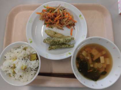 11月8日は「いい歯の日」です。そこで今日の給食には、かみごたえのあるするめいかやカルシウム豊富な小魚を取り入れました。普段から噛むことを意識して食べるようにしましょう。
