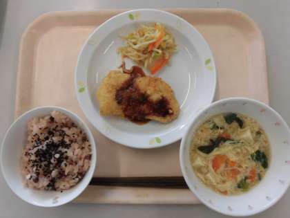 明日11月17日は赤堤小学校の開校記念日です。そこで今日の給食はお祝いメニューで『赤飯』とおかずはボリューム満点『チキンカツ』にしました。
