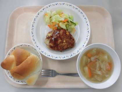 今日のハンバーグには、角切りに切った「りんご」と「チーズ」が入っています。加熱することでりんごは甘みが増して美味しくなります。食べる場所で、甘みや塩味と違った味を感じられる面白いハンバーグです。