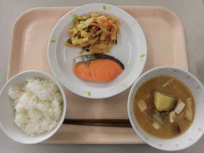 明治22年に貧しくて弁当を持ってこられない児童に食事を提供したのが学校給食のはじまりと言われています。今日は、当時の給食(おにぎり、塩じゃけ、つけもの)をアレンジしました。