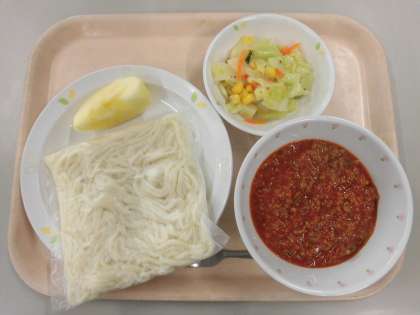今日は昭和40年ころの給食を再現しました。パン以外の主食としてソフト麺が登場し、飲み物が脱脂粉乳から牛乳へ切り替わりました。今日はミートソースにしましたが、当時はうどんのおつゆやカレースープなどのメニューもあったようです。