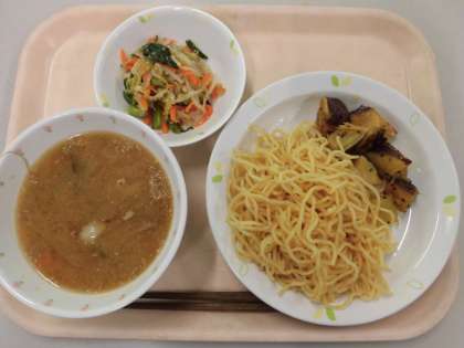 今日は『みそラーメン』です。器に入りきらないので、めんとスープを別々のお皿に盛りつけていますが、食べる前にめんをスープの中に入れていただきます。