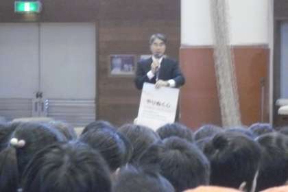 今月の人格の完成「やりぬく心」について、吉村校長が、「何事も続けることが大切であるので、くじけずに、どのようなことであっても、やりぬいてほしい」と話しました。
