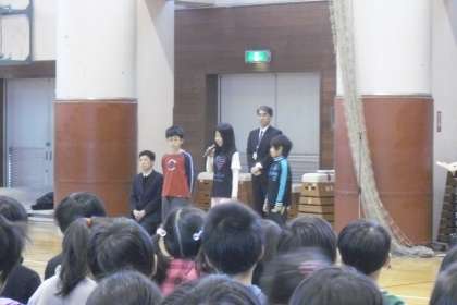 次に、あいさつキャンペーンについてたてわり班15班、14班、13班の代表児童が「あいさつすると気持ちがいいので、あいさつをしましょう」と呼びかけました。