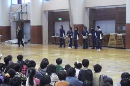 最後に、本日行うダブルダッチ教室の日本体育大学の6名の学生の紹介を行い、模範演技を見ました。難易度の高い技に、感嘆の声があがりました。