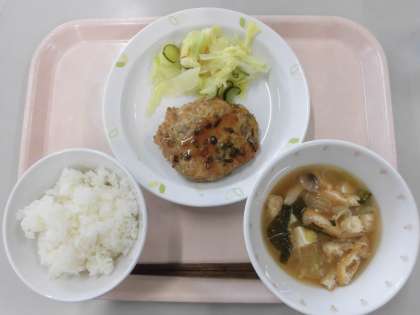 今日の『鶏ごぼうバーグ』は鶏の挽肉に、砂肝ミンチと豆腐、ねぎや人参などの野菜も混ぜ込んで焼いた和風ハンバーグで、甘めのしょうゆだれをかけて仕上げています。良く味わって食べると、ごぼうの食感や香りが感じられます。