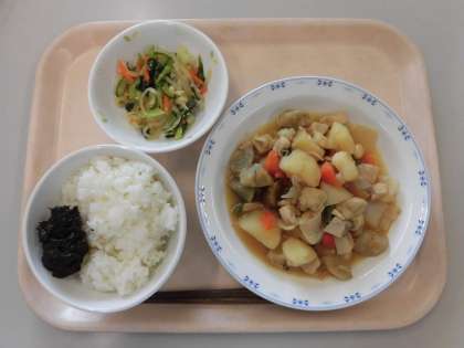 「のりの佃煮」も給食室で手作りしました。乾燥したのりを水に浸して戻し、調味料を加えて煮詰めて作っています。出来立ては、海苔の風味も感じられておいしいです。